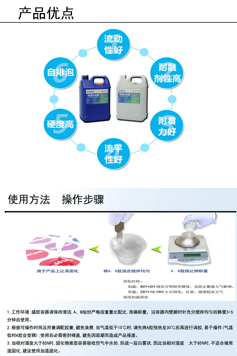 1.工作环境:盛胶容器请保持清洁,A、B组份严格按重量比配比,准确称量,沿容器内壁顺时针充分搅拌均匀后静置3-5分钟后使用。
