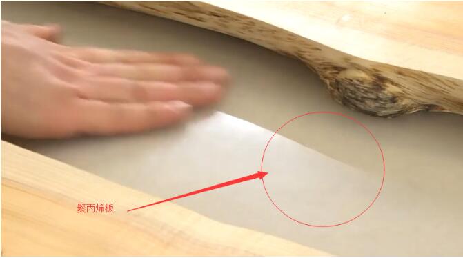 周围的挡板我们也是采用聚丙烯板,这里需要用到切割工具把聚丙烯板切成一条条的长条,再利用热熔胶枪把它底部跟对角粘接起来,避免在倒入河流桌专用的汇来树脂胶的时候会渗透出来,注意,如图中展示的,边缘需要留出部分空间,用以放置木材挡板。